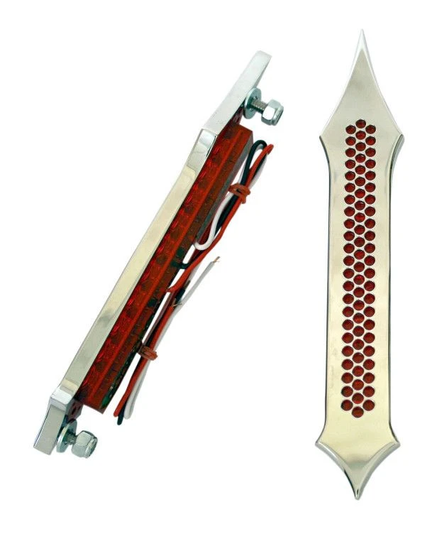 These light housings are machined from 6061 T-6 billet aluminum and contain 10 LEDs behind each red lens. They can be wired to run as run/turn/brake or accent lights. They are available in either Night Series Black or Chrome finish and have either a drilled or wide-open slot design.