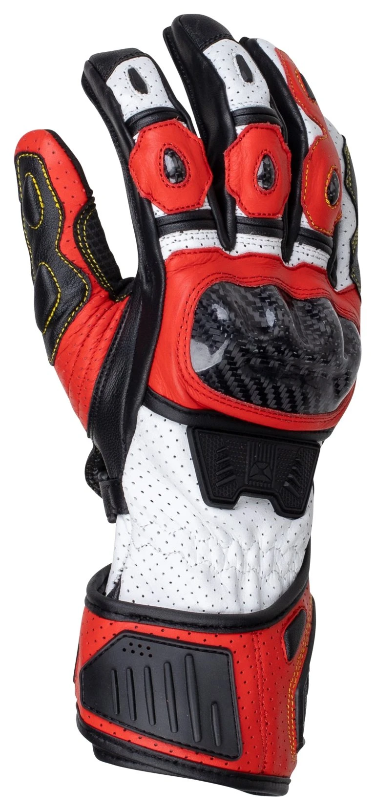 The Cortech Apex RR Gloves are an uprated street glove that mirror Cortech’s top level race gloves with carbon fiber hard parts and reversed-seam finger assembly. The full leather construction is spec’d more aggressively with goat hide at the palm for better communication through the grips. A microfiber palm overlay increases slide durability further. Finger, knuckle and palm sliders are genuine carbon fiber. Silicone grips at the index, middle finger and crook of hand keep a secure grip on the gas. Generous levels of perforation start at the touchscreen-friendly fingertips and continue all the way back to the end of the Apex RR’s gauntlet. Double hook and loop closures at the wrist and cuff complete track-inspired features list.