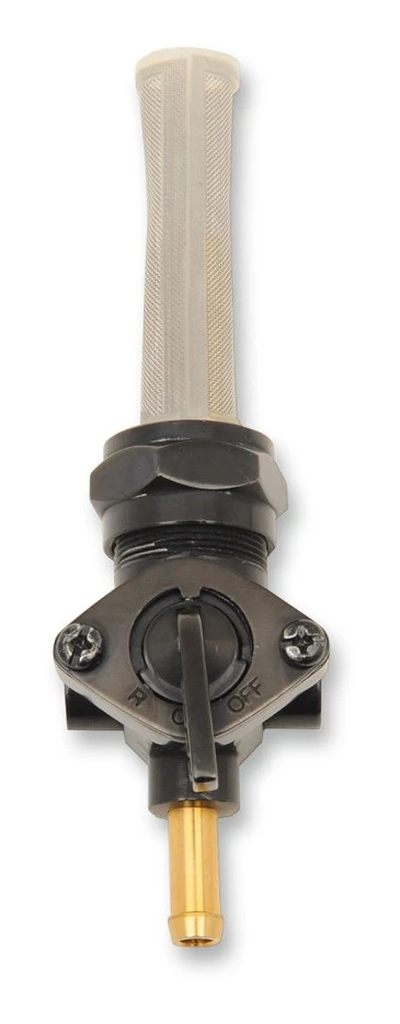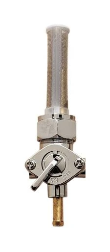 This chrome 22mm petcock includes a three-position control lever with reserve. It has a 5/16″ barbed spigot and a high-flow fuel filter screen.
