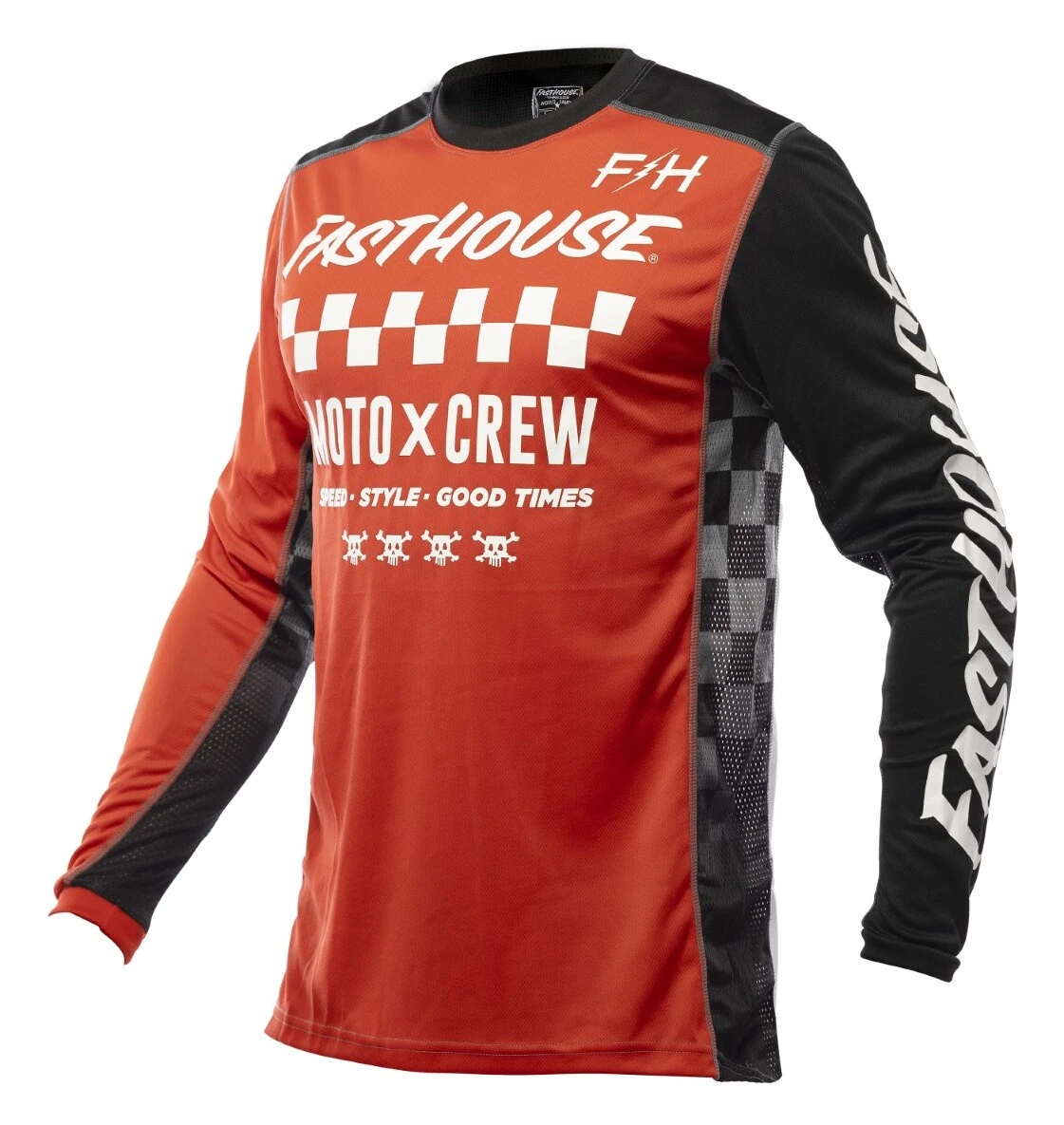The Fasthouse Grindhouse Alpha Jersey is a race day essential for any serious rider. Dyed polyester ensures that colors stay vibrant while an over locked stitching pattern gives extra strength and durability. This keeps the jersey looking as good as the day it was delivered. Moisture wicking fabric keeps riders dry all race and high quality silk screening keeps the graphics on the jersey.