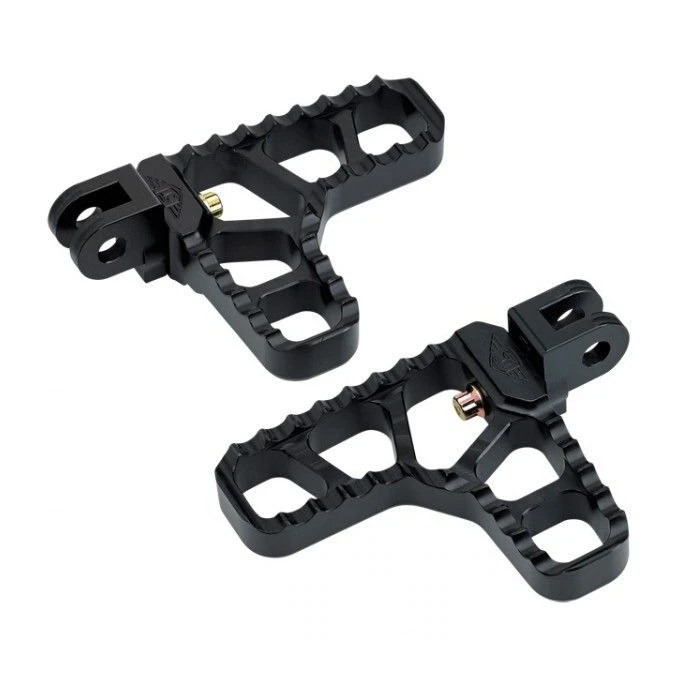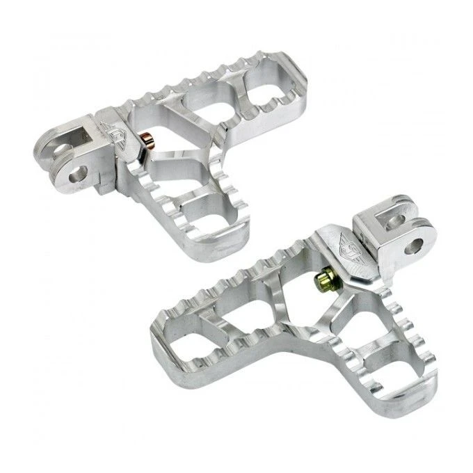 Give your bike a unique design twist with these all-billet aluminum adjustable serrated footpegs. The comfortable serrated foot surface area gives you a wider area while the heel section works great for driver or highway pegs and provides a good bite onto the bottom of your shoe. Full 360 degree rotation makes these footpegs perfect for any application. Footpegs have a pitch adjustment screw that enables you to change the angle of the peg in order to adjust it to a level riding position so the pegs don’t appear to sag.