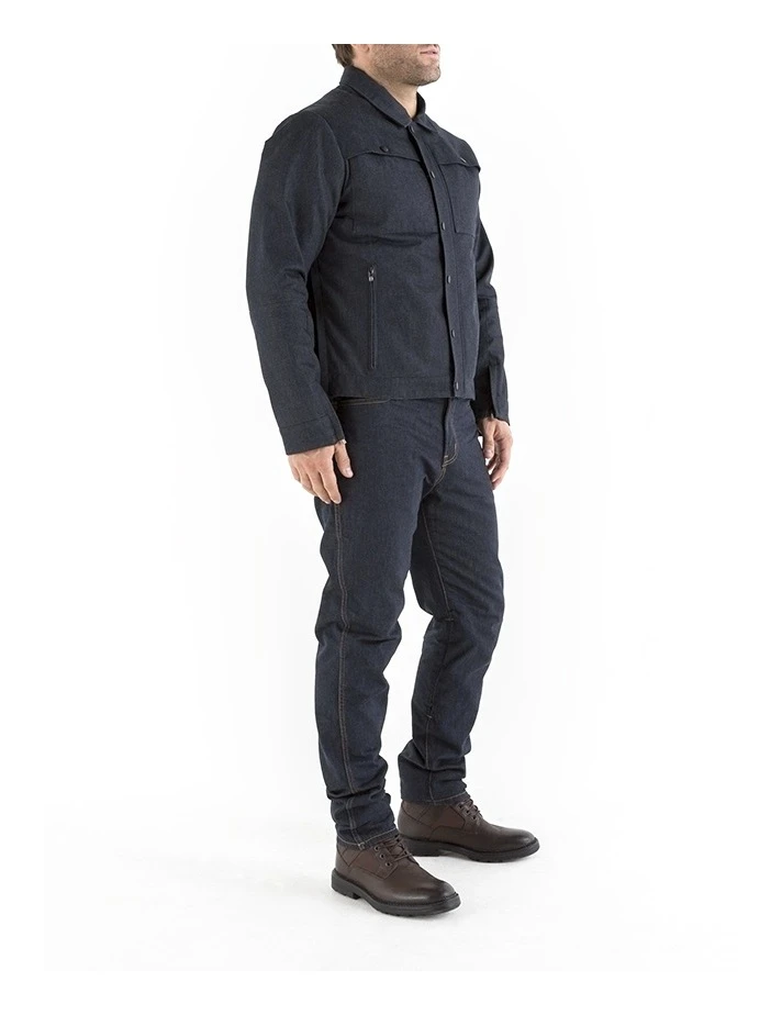 A modern take on a classic, the Knox Haydon Denim Jacket is made with superior 12oz Cordura denim and features a removable faux shearling lining. The DuPont™ Kevlar® fabric lining over the back, shoulders and elbows provides extra abrasion resistance while the Knox Dual Fit system allows you to resize the jacket so you can wear it on or off the bike.