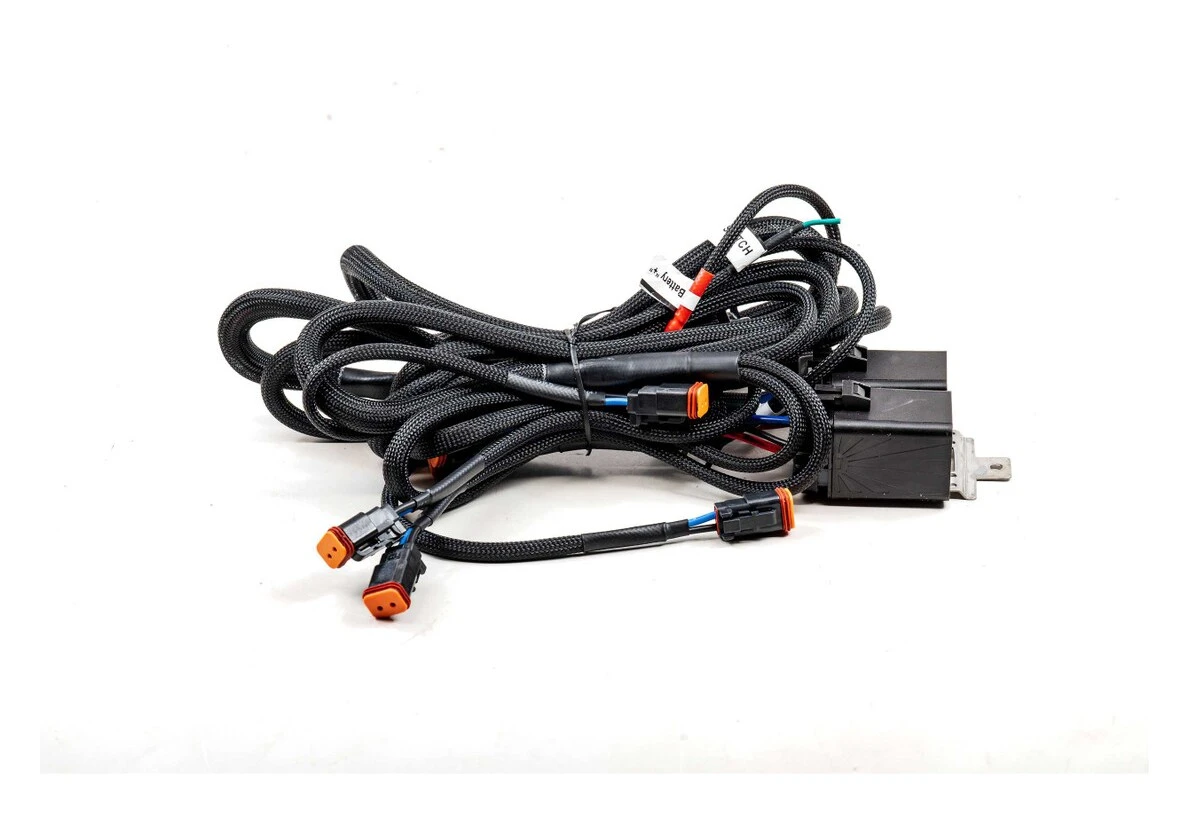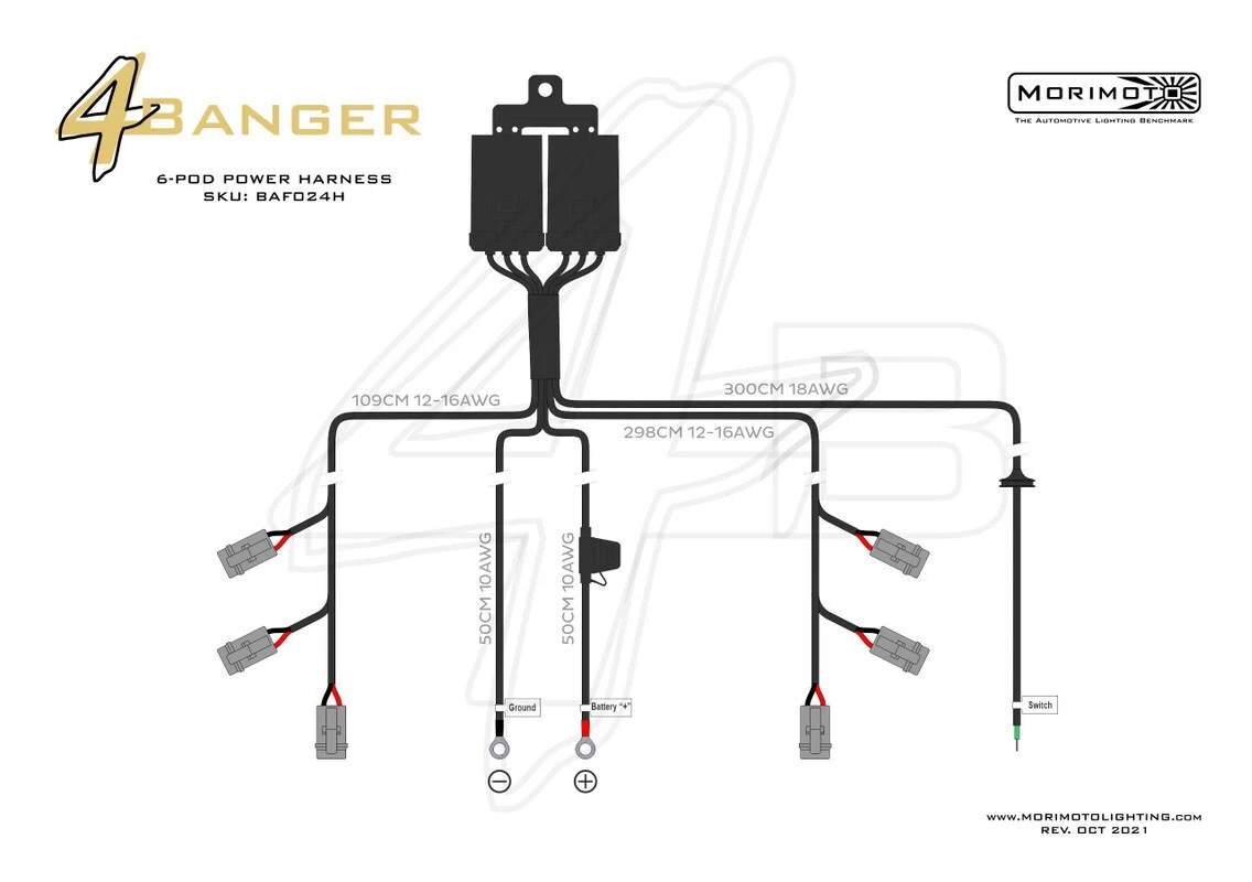 The high quality you have come to know from Morimoto can be seen even in this 6 Pod Power Harness. Not one component of the harness was overlooked for the sake of cost or simplicity. Triple-sealed 4-pin relays with dual-hanger and over-molded inline fuse holder with 40A ATO fuse. The DT06-2S female outputs are designed with dual seals. Stainless steel power and ground terminals to ensure longevity. M-Spec push button switch with Yellow-LED backlight for better visibility. All wiring is properly sized and relays are rated for flicker-free reliable power delivery for up to six off road lights. Every line of the 10 AWG copper wiring is protected with black mesh insulation. Every connector has been over-molded, sealed, or protected with heavy duty heat shrink. The connections on the harness have been laid out to power up to three LED pods on each side of your vehicle. There are six total outputs and includes a positive battery terminal, ground terminal and a switch. The wiring for the in-cabin push button switch has an in-line barrel connector that drastically improves ease of installation. While this harness is a perfect match for the Morimoto 4Banger LED pods you can make good use of it with any other off-road lighting setup that takes a DT-style two-pin input.