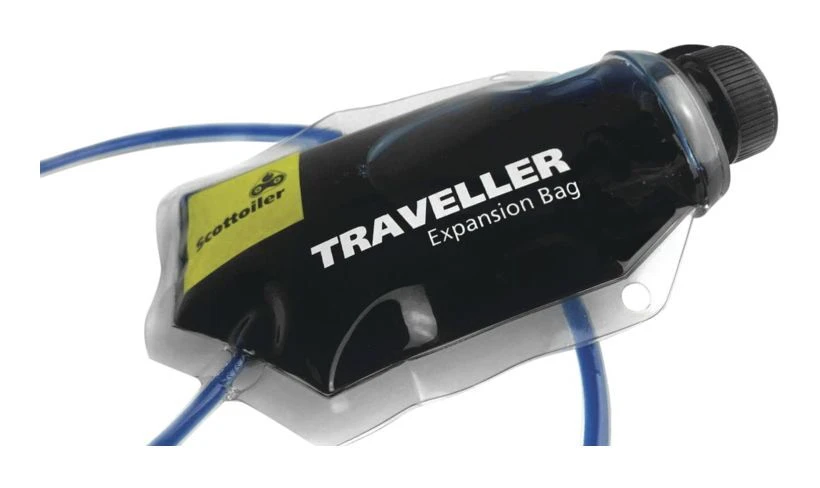 The Scottoiler Traveller Expansion Oil Bag is a plug-and-play, range extending reservoir suitable for all Scottoiler Chain Oilers. The Traveller has been designed to fit all motorcycles and the flexible bag can be squeezed into the smallest of spaces even on the most compact of machines. Simply fill the Traveller and plug-in to your Scottoiler system for an additional 2,500 miles of riding between refills.